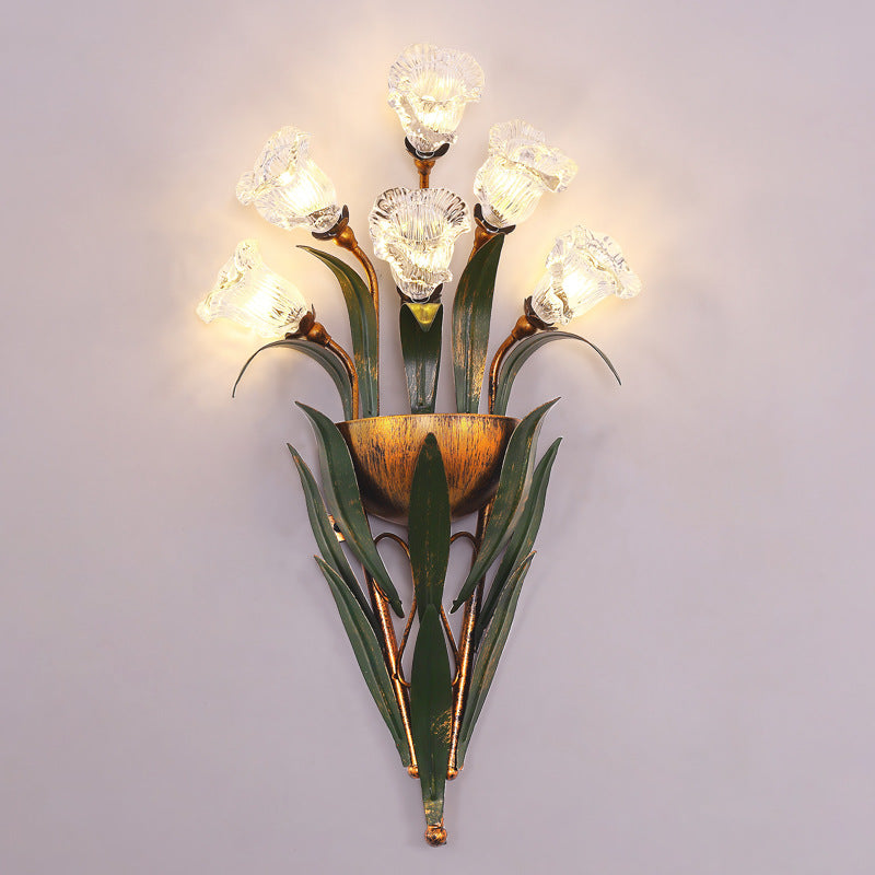 Handcrafted with exquisite attention to detail, this luxurious wall lamp features seven delicate, frost-white glass blossoms that bloom upward in a natural bouquet. Each petal is softly translucent, allowing warm LED light to glow through like morning dew catching the first rays of sunlight. The stems and leaves are meticulously sculpted from antiqued brass and hand-painted in deep verdant green, creating a stunning contrast against modern or classic walls.